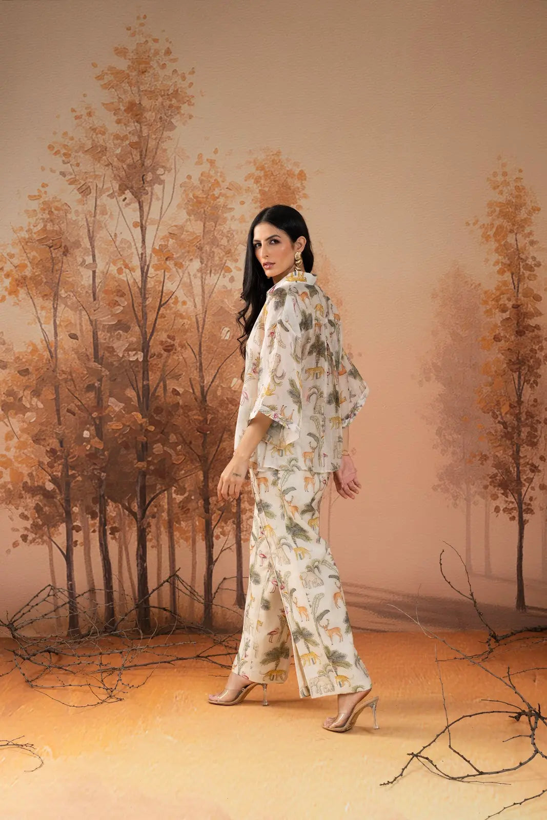 Breezy and artistic, our cream mal chanderi co-ord set features a soft, flowing silhouette adorned with a hand-illustrated animal digital print inspired by lush landscapes. The relaxed shirt and wide-leg trousers offer comfort and sophistication, making it an easy yet elevated choice for daytime outings, holidays and relaxed luxury dressing.